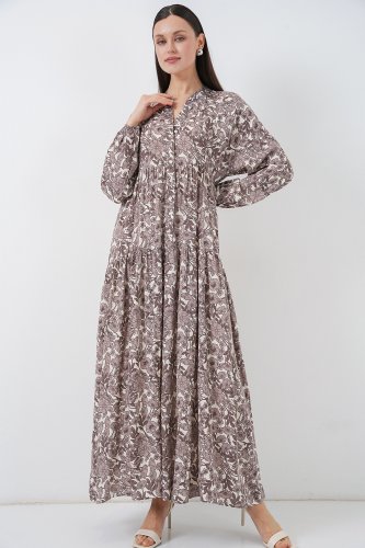 Desenli Uzun Tesettür Elbise 2585 T Kahverengi
