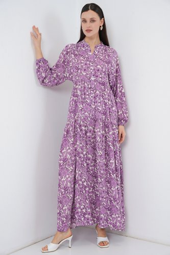 Desenli Uzun Tesettür Elbise 2585 Lila