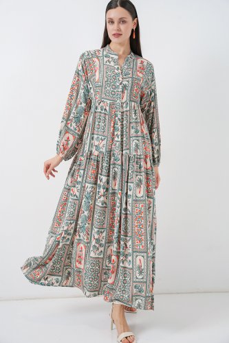 Desenli Uzun Tesettür Elbise 2585 Çağla