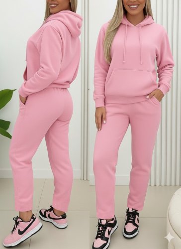 Kadın uzun kollu kapşonlu bağcıklı üç iplik bluz ve pantolon ikili takım