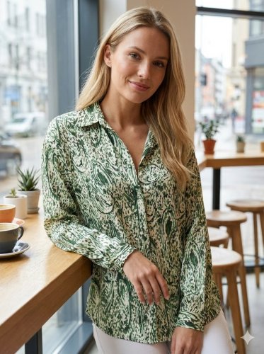 Kadın uzun kollu dalgalı desen baskılı gömlek
