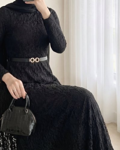Kemerli Astarlı Güpür Dantel Elbise Siyah