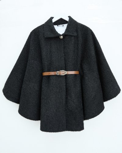 • Tek Düğmeli Beli Kemerli Sakallı Panço Siyah