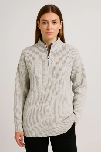 KADIN Yarım Fermuarlı Triko Kazak Selanik Örgü Dik Yaka Pamuklu Dokuma Oversize Uzun Kollu Kışlık Model Gri