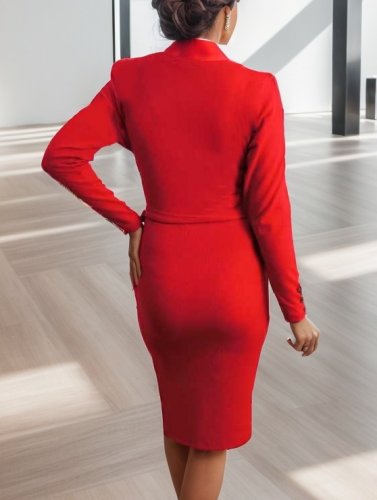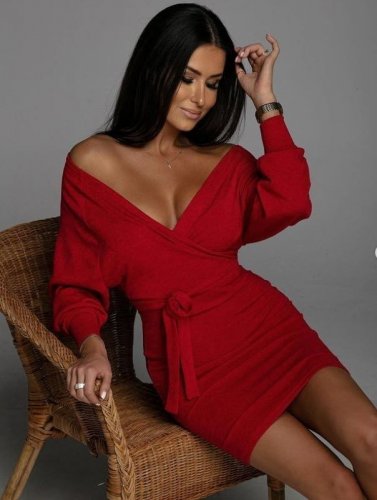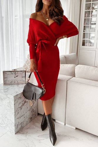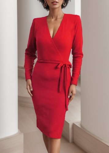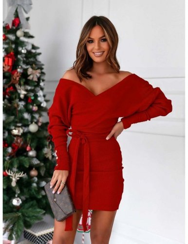 • Kadın uzun kollu kruvaze yaka bağcık detay akrilik mini boy elbise
