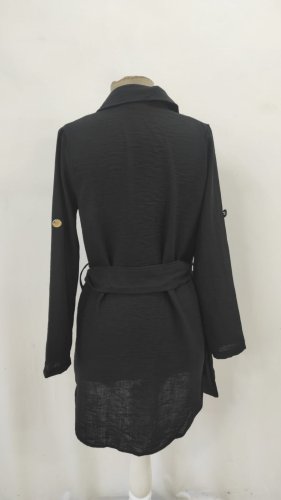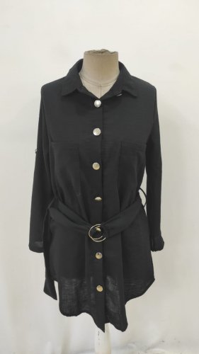 • Kadın uzun kollu yakalı önden düğmeli beli kuşaklı mini ithal keten elbise