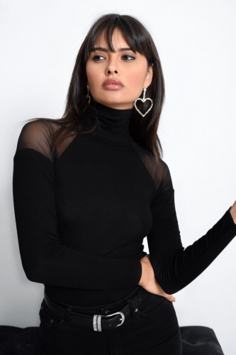 • Kadın omuzları tül balıkçı yaka viskon kumaş bluz