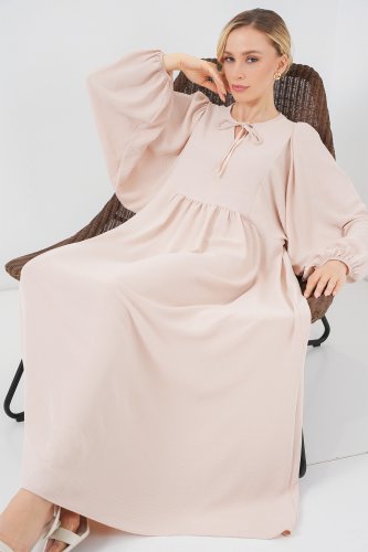 • Balon Kol Uzun Tesettür Elbise 2464 Krem