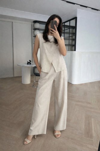 • Kadın keten kumaş asimetrik kesim bluz ve salaş pantolon ikili takım