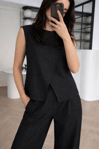 • Kadın keten kumaş asimetrik kesim bluz ve salaş pantolon ikili takım