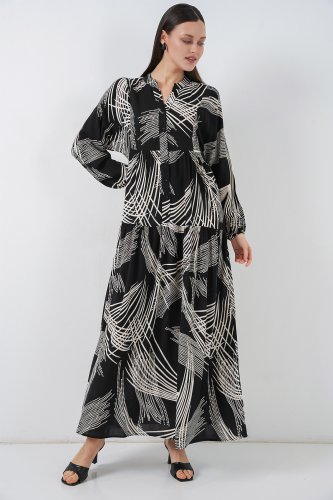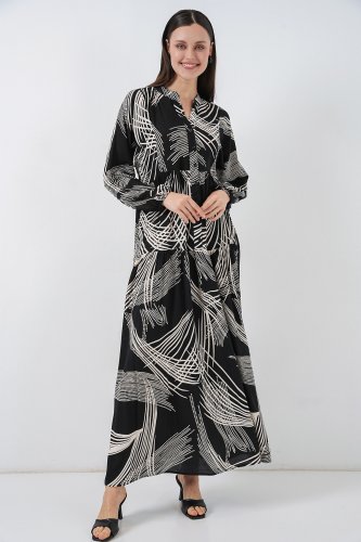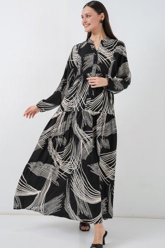 • Desenli Uzun Tesettür Elbise 2585 MSiyah
