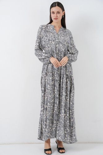 • Desenli Uzun Tesettür Elbise 2585 Gri