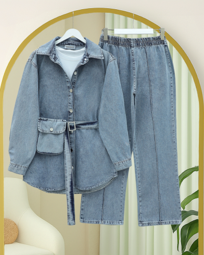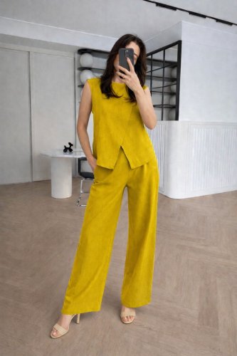 Kadın keten kumaş asimetrik kesim bluz ve salaş pantolon ikili takım