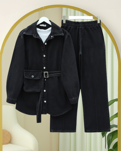 Kadın uzun kollu omuz dekolteli bluz ve palazzo pantolon ikili takım