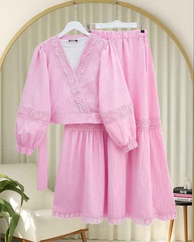 Dantel Detaylı Bağlamalı Kolu Lastikli Kraş Etekli Takım Pembe